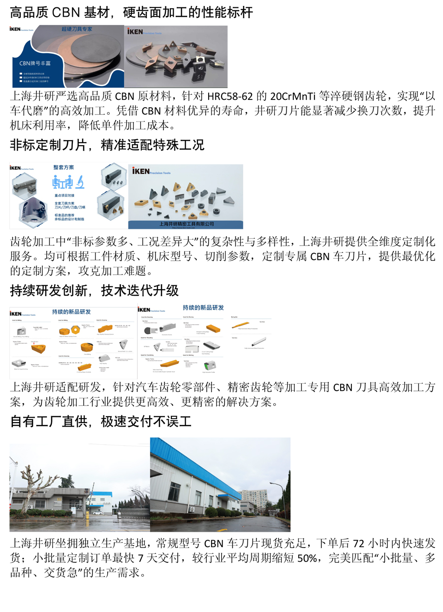 上海井研精密工具有限公司(IKEN)成立于2011年,是一家位于上海市集研究、开发、生产和销售CBN与PCD精密超硬刀具为一体的技术型企业。产品主要应用于汽车、铁路、造船、航空、医疗、能源等行业单位。公司坚持秉承核心企业价值观:"公平公正"、"合作开放"、"学习创新"、"创造价值",以市场为向导,以创新为手段,积极开拓国内外市场,致力于为客户提供更高效、更经济、更绿色的金属加工解决方案。